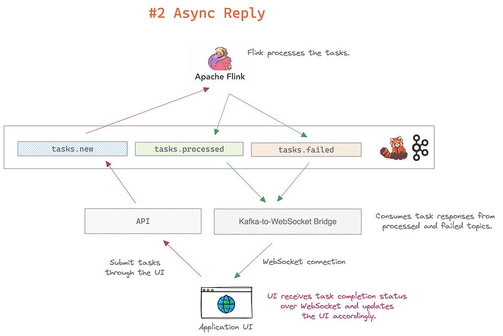 In this pattern, we can put an API to receive the task from the UI. Once received, the API or a Microservice places it on the tasks.new Kafka topic for processing. The UI then establishes a WebSocket connection to receive the task processing status asynchronously.