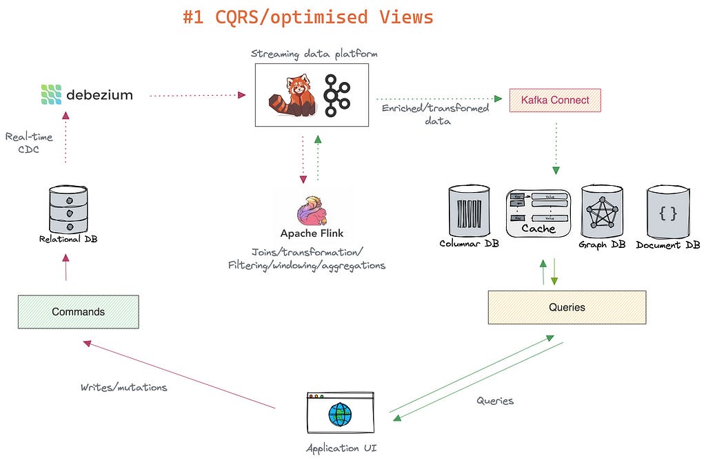 The above pattern uses a relational database for writes and a NoSQL database for reads. The changes in the write database are captured in real-time with Debezium, a Change Data Capture (CDC) framework built on Kafka Connect. Captured changes are written a Kafka topic, allowing Flink to perform optional data massaging, such as joins, enrichment, etc., and write them back to another Kafka topic. Finally, Kafka Connect synchronizes the processed output with the destination database, which can be a NoSQL database or a real-time OLAP database like Apache Pinot.